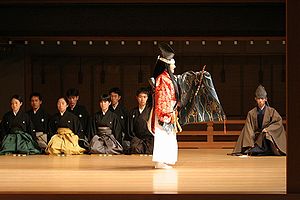 Instrumentalists known as hayashi sit at the back of the stage. They consist