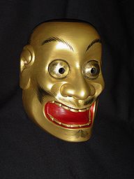 In the noh Kamo, the main character in the latter half of the play wears a mask called gOh-tobide.h Oh-tobide means a startled expression. It features big eyes and a wide open mouth. It is said that O-tobide was incarnated from a public servant and became the god of thunder. It is used for roles of demons who move rapidly and violently.http://www.nohmask21.com/eu/ohtobide.html |